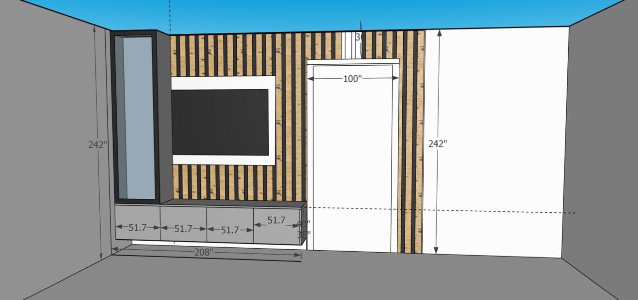This custom interior wall design features a vertical wooden slat panel system extending to approximately 242 cm in height, creating a strong visual backdrop for the media area. A 208 cm long base cabinet composed of four 51.7 cm modules provides practical storage beneath the television. On the left side, a tall display cabinet reaching 242 cm adds vertical balance and additional storage. The central wall composition integrates the TV area and door opening, resulting in a clean, structured decorative wall that combines functionality with modern interior design.