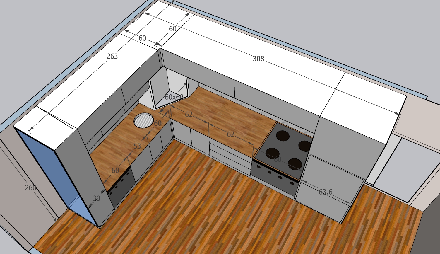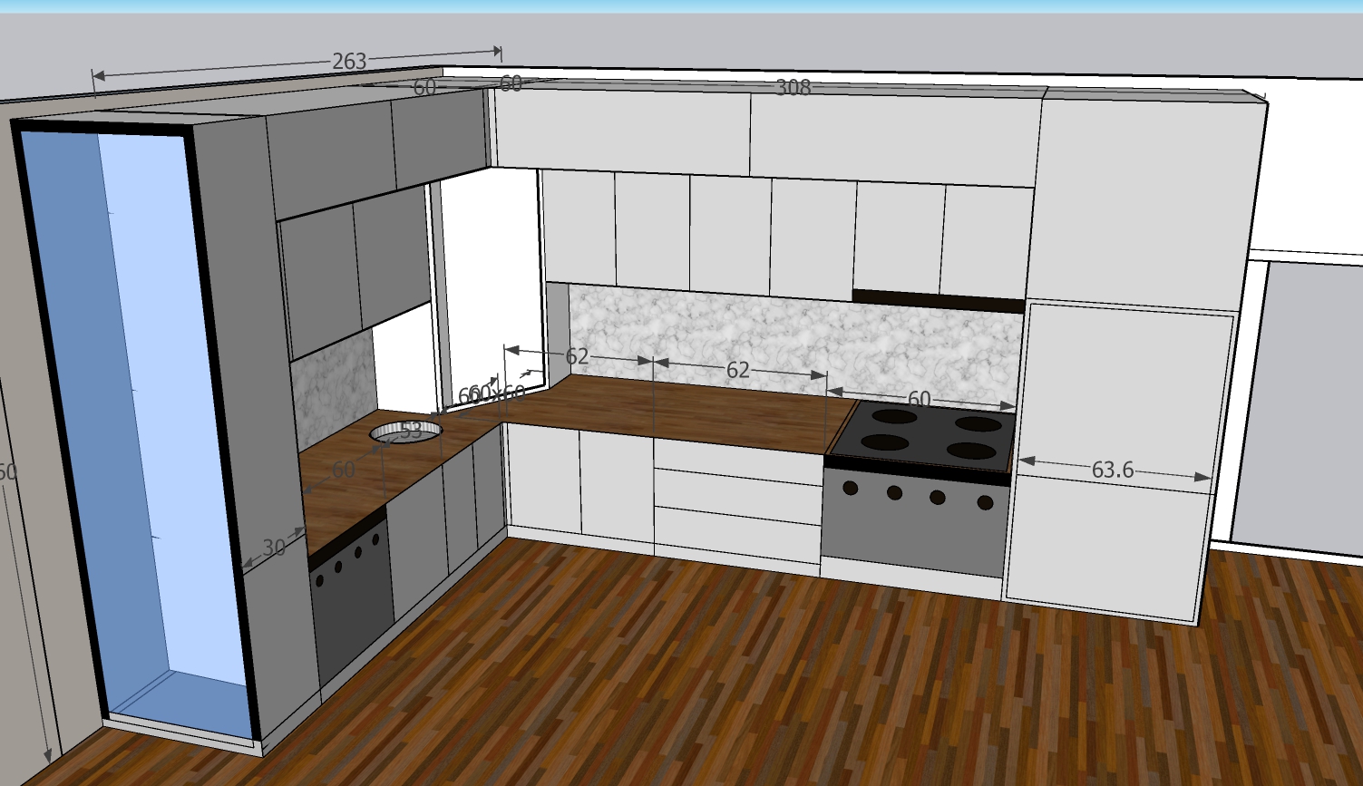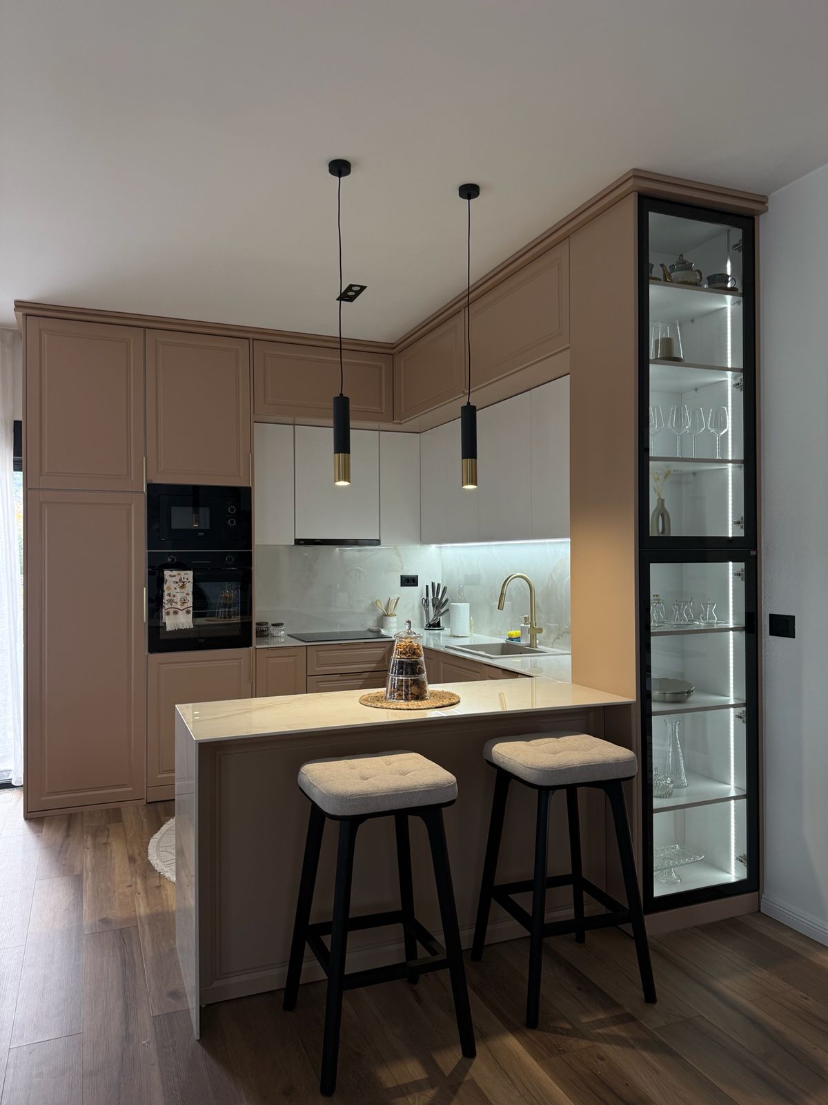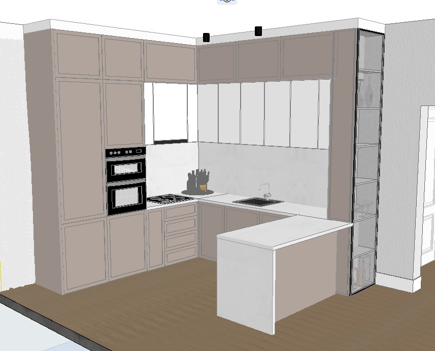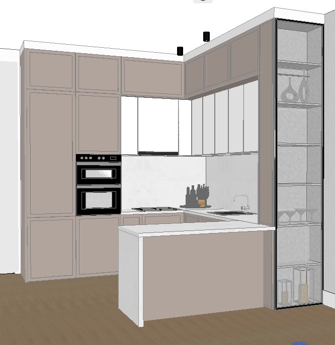 The project includes a unit measuring 263 × 308 × 270 cm with a total area of 5.71 m². The interior structure is made of chipboard, with illuminated cream-colored MDF doors. The design includes black glass with aluminum profiles. All door and drawer mechanisms are GTV soft-close systems. The price does not include the worktop.
