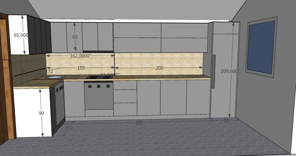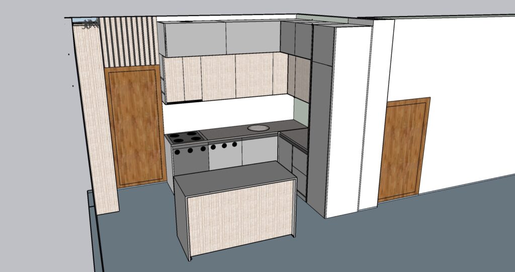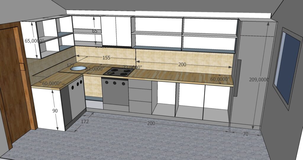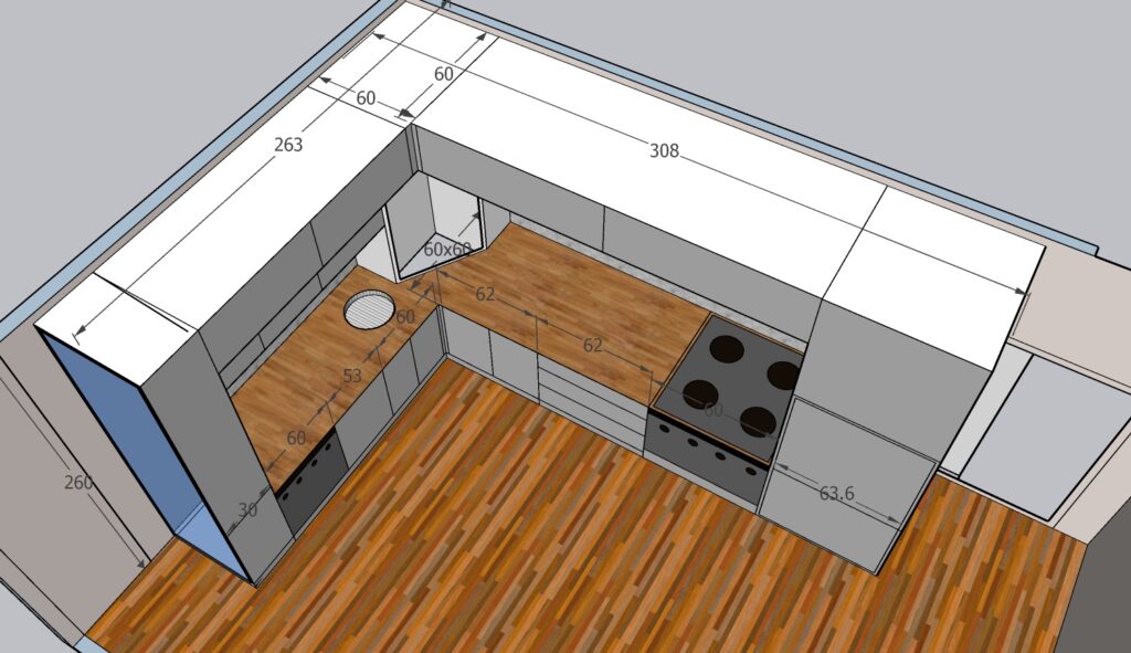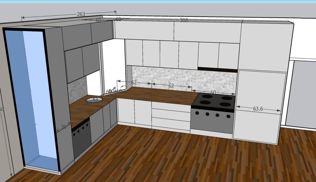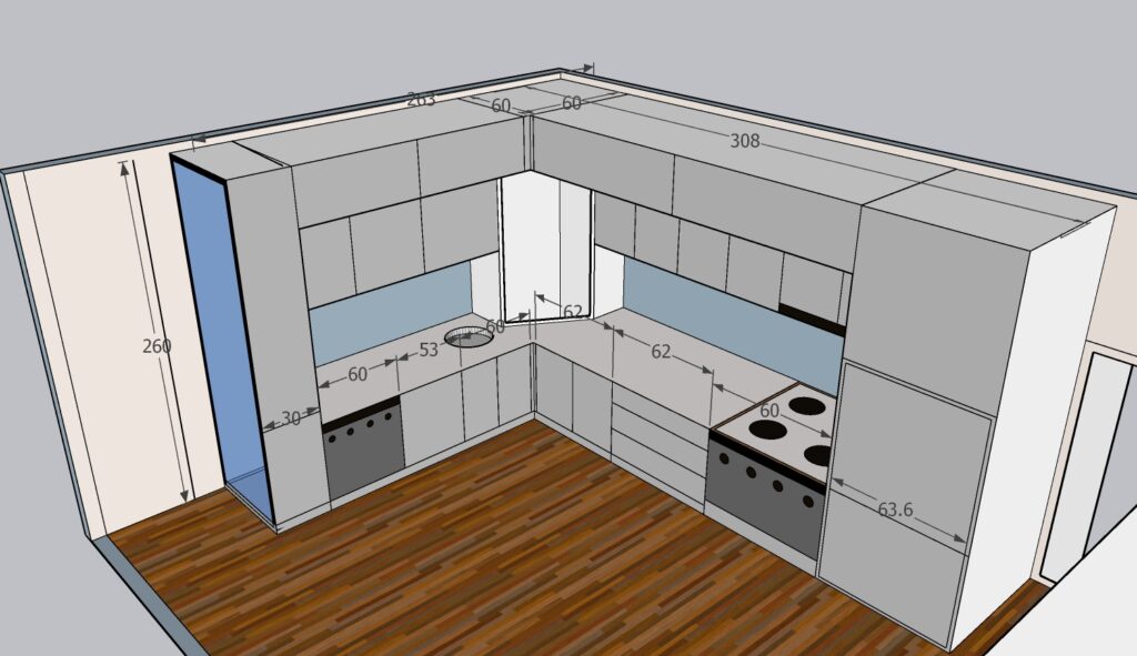 The project includes one unit measuring 200 × 250 × 270 cm, one counter measuring 130 × 60 cm, and one beverage cabinet measuring 120 × 270 cm. The interior structure is made of chipboard, with MDF doors, and some doors made of chipboard with veneer finish. All mechanisms, including hinges and drawer systems, are complete GTV fittings. The kitchen worktop is not included in this price.