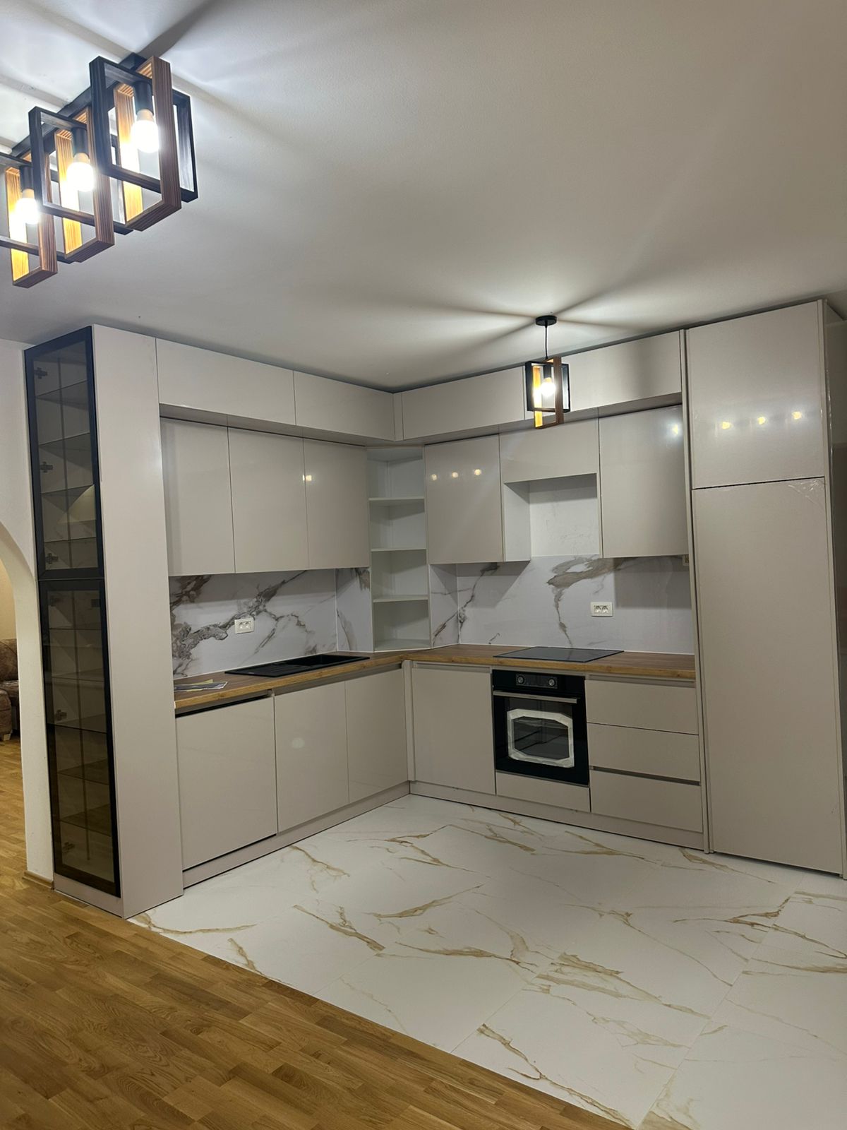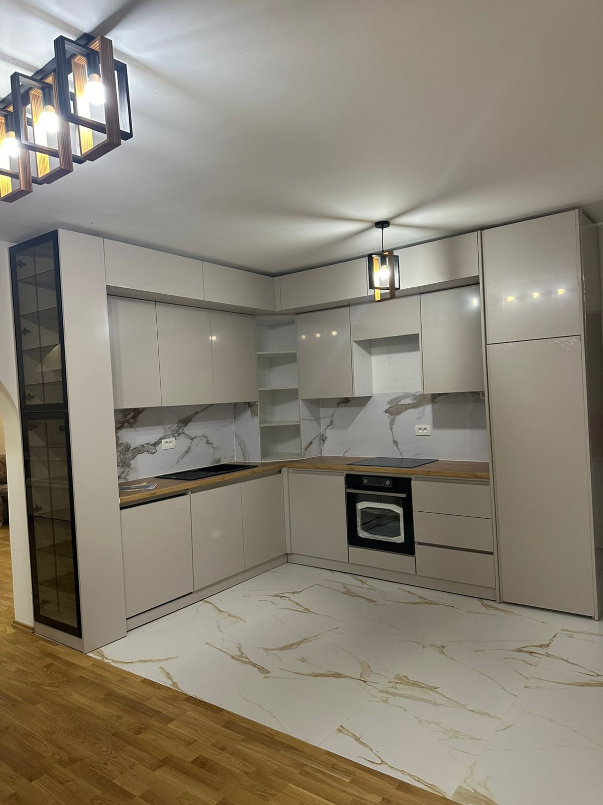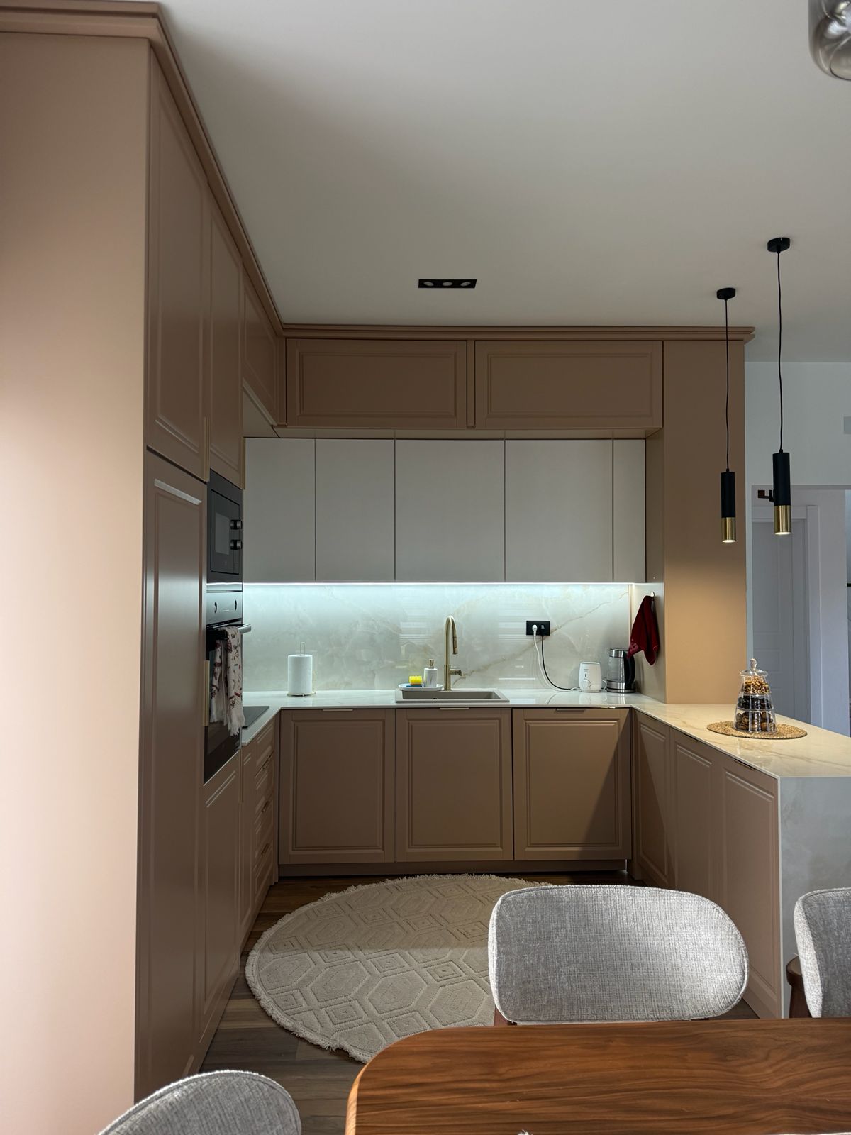 The project includes a unit measuring 300 × 300 × 270 cm (6 m²) and one counter measuring 130 × 60 cm. It is made of lacquered MDF, with all drawers and doors equipped with GTV soft-close mechanisms. The design includes black glass with black aluminum profiles and LED lighting. The worktop is not included in the price, as it is planned to be made from a different material, specifically marble.